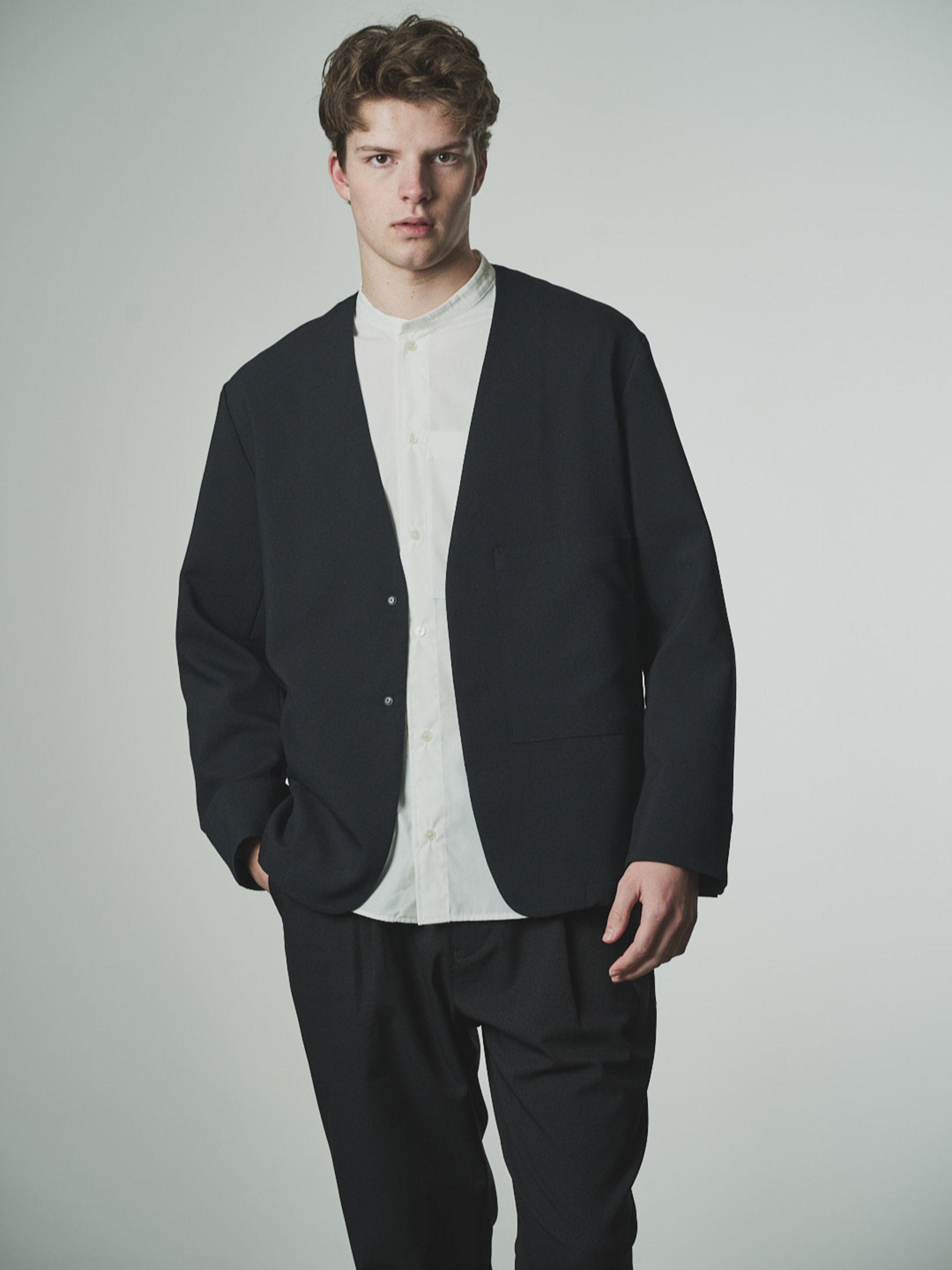 ノーカラーでカーディガン代わりにシーンを選ばずに重宝します。 ストレッチ性があり、シワになりにくい素材です。